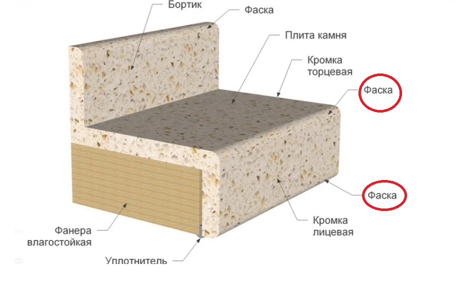 В стандартном исполнении фаска может быть радиусная или 45 градусов. Если кухня или элементы мебели выполнены в классическом или ином стиле - выбираем фаску из предложенных поставщиком. Следует учесть, что от вида фаски будет сильно зависеть цена изделия. Кроме того, сложные сборные фаски изготавливаются исходя из технических возможностей обработчика камня. (статья про фаски)